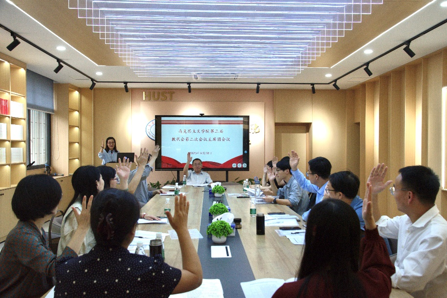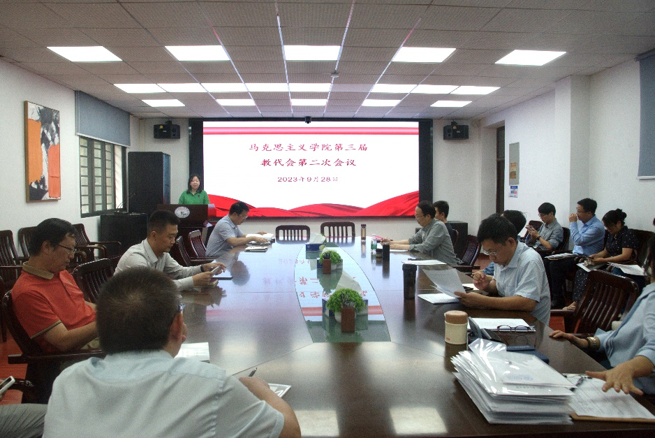 首先,院长岳奎作学院工作报告。他从强化理论武装、健全工作机制、夯实支部建设、加强师德师风教育等四个方面对学院整体工作进行回顾,并对取得的工作成果进行总结。他表示,过去一年多来,学院学科建设及科研管理工作成效显著,高水平科研成果持续增长,本科生教学管理工作质量不断提升,研究生培养管理工作持续推动,研究生就业渠道进一步拓展,办公业务治理工作建章立制,师生学习工作条件得到改善。随后,他对新学年学院工作进行展望,提出学院要继续在党建工作、思想政治教育、思政课建设、学科建设、科研管理、研究生培养和社会服务工作等方面加大力度,做强做实四个研究所、两个研究中心,积极为师生办实事、谋发展,持续增强师生获得感、幸福感,扎实推进习近平新时代中国特色社会主义思想入脑入心,见行见效。