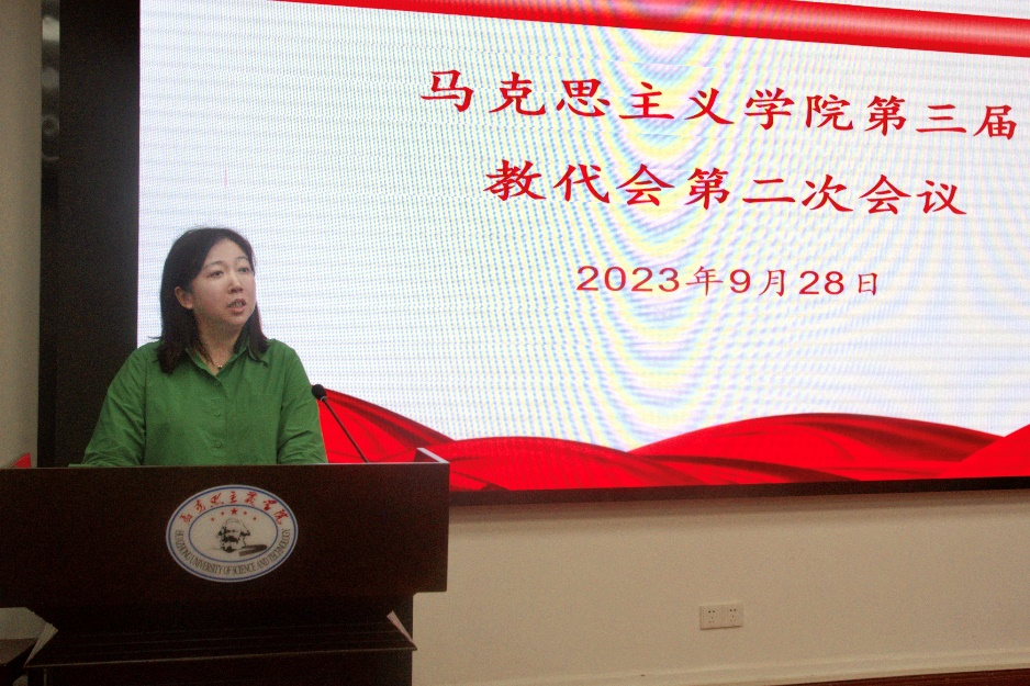 最后,学院党委书记刘雅然作总结发言,她对过去一年多来学院工作总体情况以及教师代表提出的建议给予充分肯定,指出学院要继续乘势而上,抢抓先机,确保四方面工作持续推进:一是要加强党支部建设,发挥党支部在教育教学、学科建设等领域的重要作用;二是要加强师资队伍建设,推动学院各项事业发展;三是要持续推动改革发展,坚持与时俱进、建好平台、打造亮点;四是要切实服务师生发展,保障教学科研及人才培养。她强调,学院全体教职工应以此次大会为契机,进一步总结经验、统一思想、凝聚力量、振奋精神,坚守立德树人初心,提升教育教学质效,为推动学院发展接续奋斗。