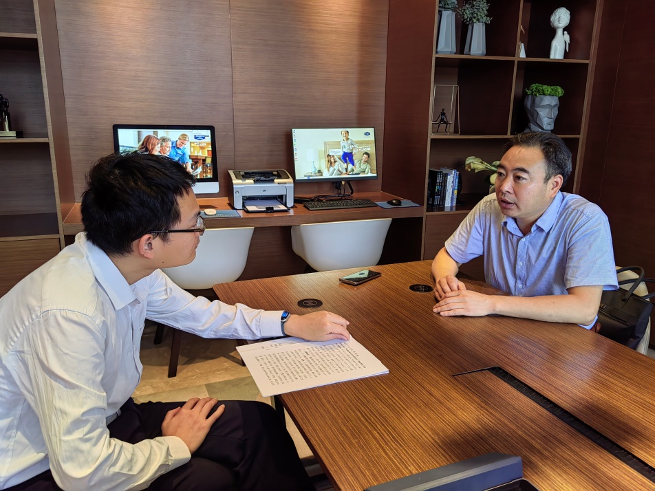 梅孜孜同参与“流动新时代文明实践站”的志愿者进行采访交流